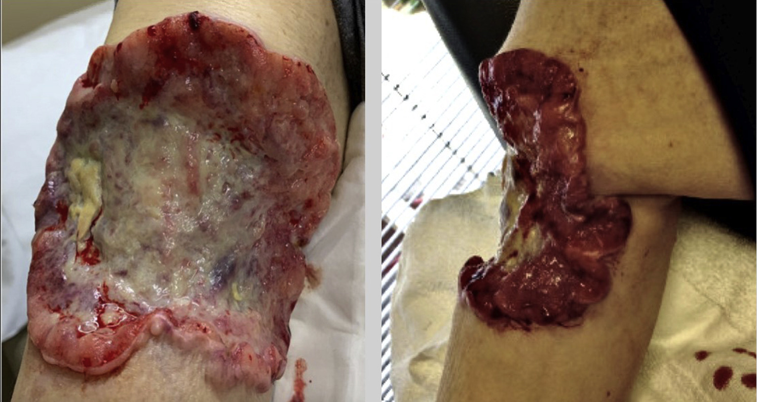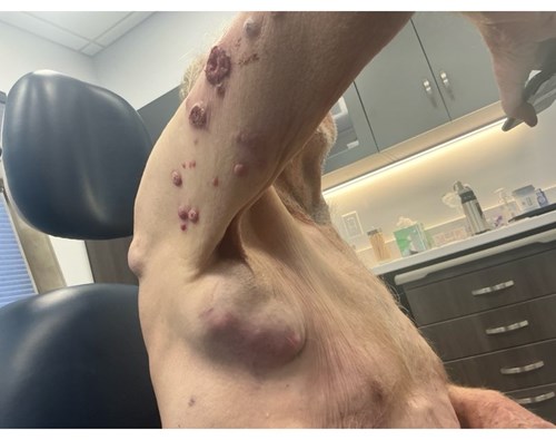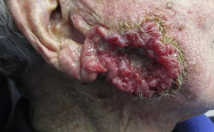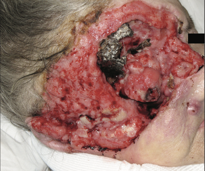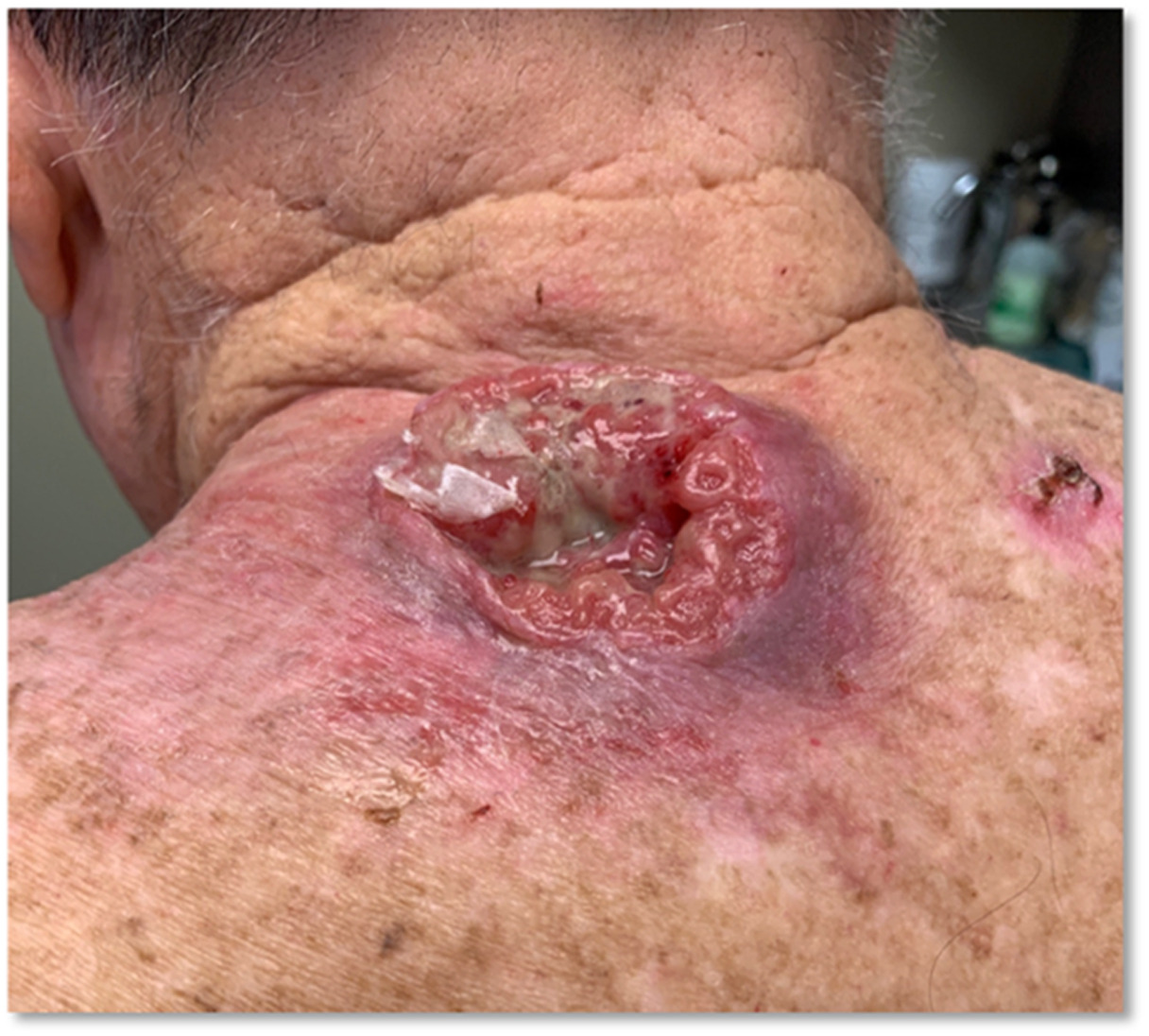 This is an unfortunate photo of a gentleman who presented to our clinic with neglected cutaneous squamous cell carcinoma that had already metastasized to surrounding skin, lymph nodes, and internal organs. His disease proved fatal.