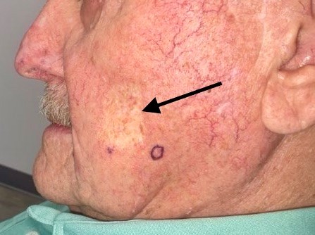 White, depressed, mottled scar on left cheek caused by previous radiation therapy for skin cancer.