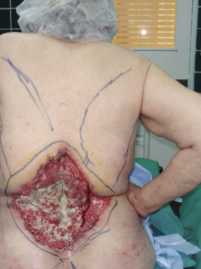 Nose, cheek, and chin severely damaged by radiation therapy for skin cancer