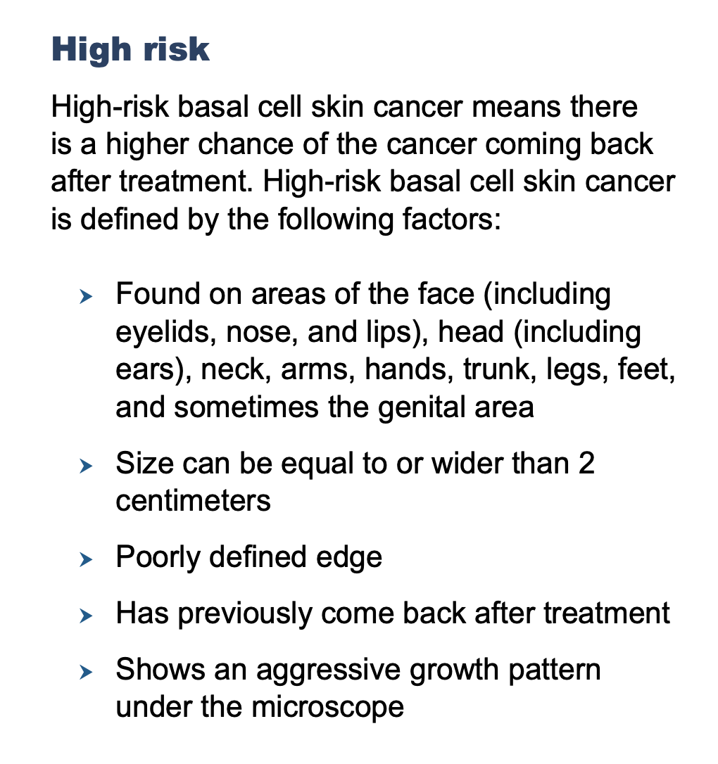 High-risk cancer as defined by the National Comprehensive Cancer Network (NCCN). Mohs surgery is the recommended INITIAL therapy for all high-risk tumors.