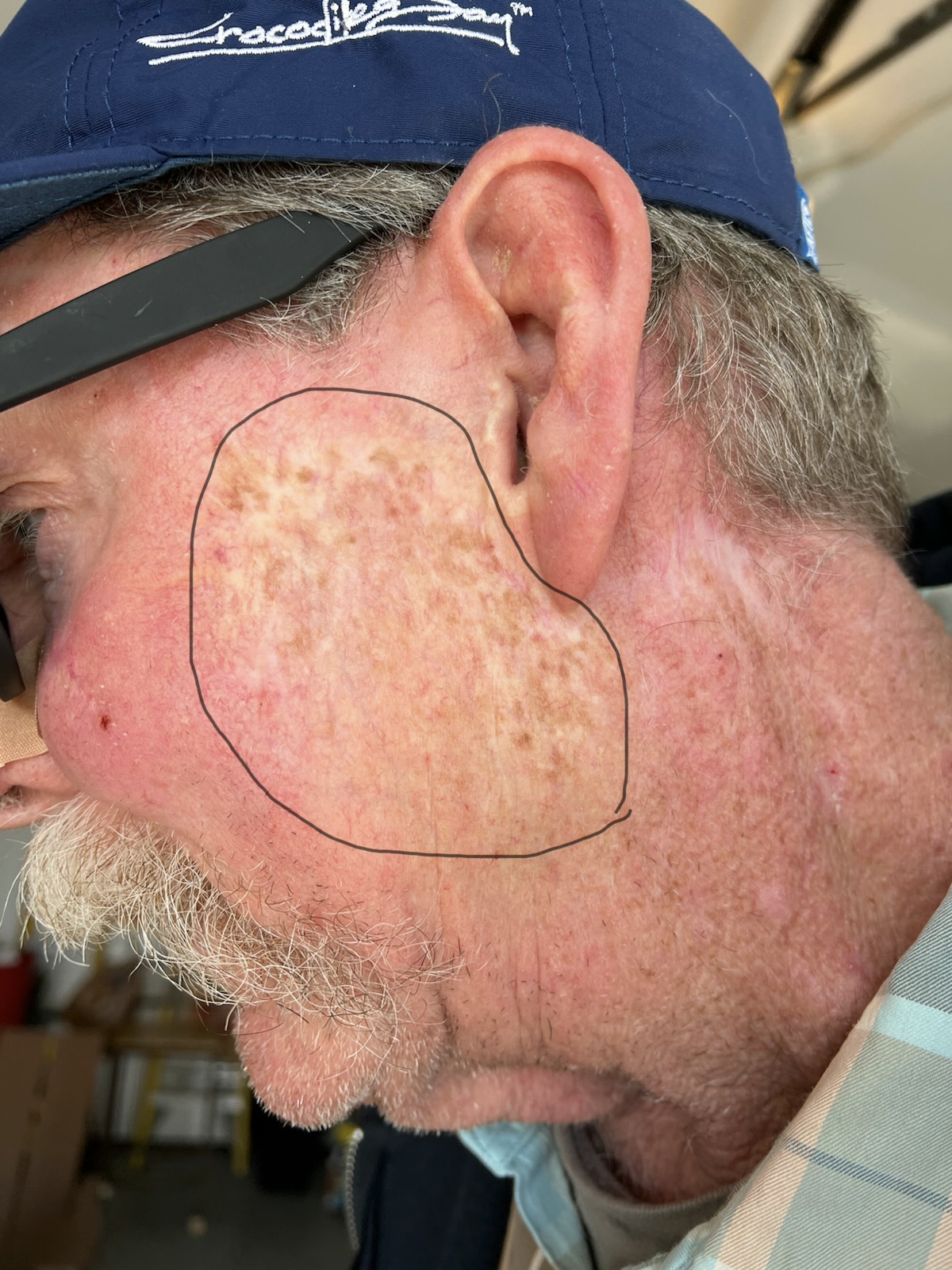 Similar, even larger, mottled scar on another left cheek caused by previous radiation therapy for skin cancer. This is permanent and will NOT improve with time.